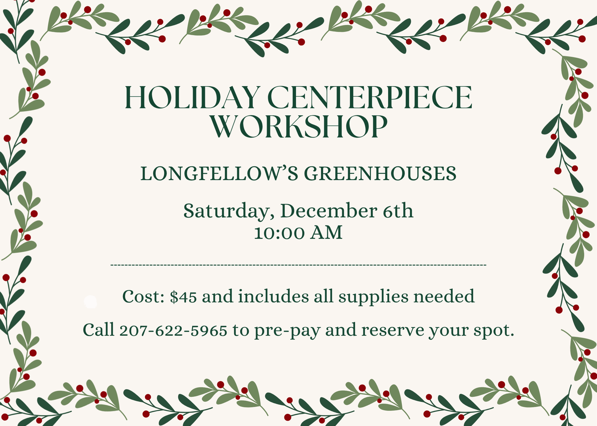 Longfellow's Greenhouses 81 Puddledock Rd., ManchesterSaturday, December 13th, 1:00pm - Longfellow's Greenhouses Join us at Longfellow’s for a special workshop, where you’ll create your own beautiful tabletop boxwood tree! Using fresh boxwood greens, you’ll decorate your tree with festive accents like bows, pinecones, and decorative picks—making it a wonderful piece for your holiday décor or a heartfelt handmade gift. The [...]